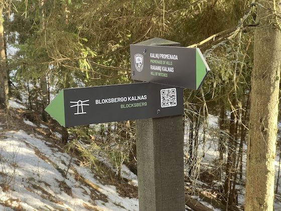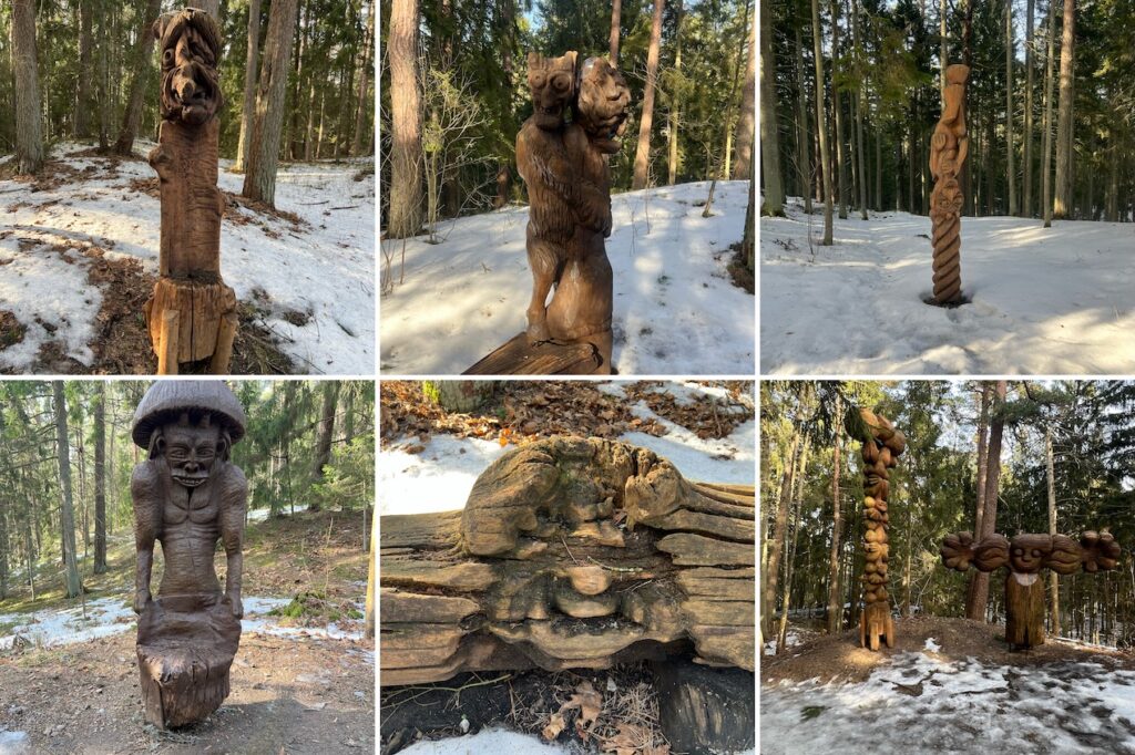 Am südlichen Ende von Juodkrantė angekommen, wanderte ich also erneut los, diesmal in einen hügeligen Wald. Der Weg war schon von der Straße ausgeschildert und führte mich zum Hexenhügel. Im Sommer vermutlich ein leichter Spazierpfad, so war mein Vorankommen teils nur im Schneckentempo möglich, denn die Oberfläche des Untergrunds bestand aus einer Eisschicht mit vielen Pfützen aus Tauwasser – es war also teilweise wirklich rutschig. Für Ablenkung haben allerdings die vielen Holzstatuen am Wegesrand gesorgt, die lustige Fratzen zeigten und kleine Throne und Bänke verzierten.