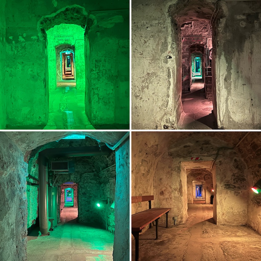 Bis zur Abfahrt meiner Fähre hatte ich noch ein wenig Zeit und ich nutzte sie, um den Teil des Tallinner Stadtmuseums zu besuchen, der in einem Kanonenturm mit dem plattdeutschen Namen „Kiek in de Kök“ untergebracht war und nicht weit entfernt meines Hotels lag. Neben Ritterrüstungen und anderen Details konnte ich vom Turm noch einmal einen Blick auf den Domberg mit seinen zwei Kirchen werfen. Der zweite Teil der Ausstellung beinhaltete den Besuch des Bastionstunnels. Es wirkte ein wenig gespenstisch, denn ich war darin offenbar der erste Gast des Tages, hatte das Museum doch erst ein paar Minuten zuvor für den Tag geöffnet. Bei düsterer Stimmung mit Klangeffekten und Beleuchtung in unterschiedlichen Farben warteten in mehreren Räumen des Tunnels eingekleidete Puppen, die seine unterschiedliche Nutzung verdeutlichen wollten – so wurde er teilweise als Bunker genutzt, teils diente er Soldaten als Weg, auf dem sie unerkannt blieben, und in den 80er Jahren trafen sich dort Punks. Die Sanierung und Integration in das Museum lagen erst ein paar Jahre zurück.