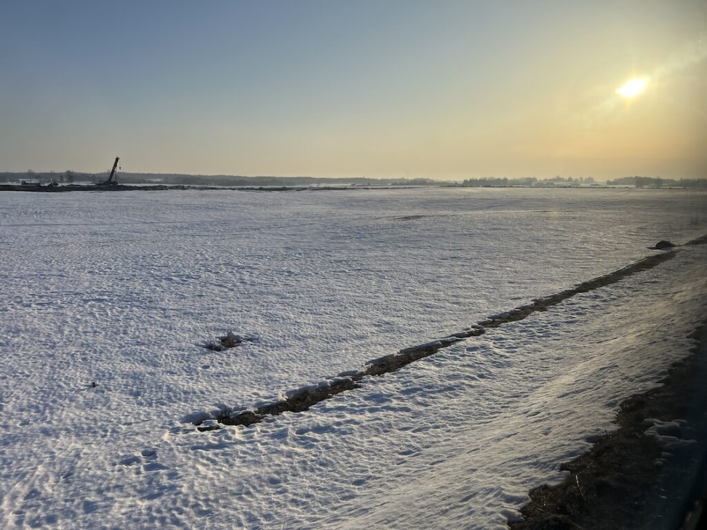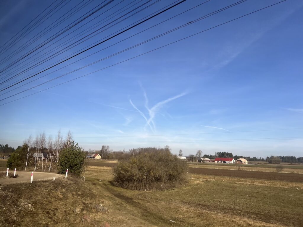 Der Zug rumpelte weiter und die Fahrt blieb spannend, denn wir näherten uns dem Suwalski Korridor, der 60km schmalen Landesgrenze zwischen Polen und Litauen. Wir fuhren durch hügelige Felder und Wälder und ich sah anhand einer zunehmenden Anzahl an Schneefeldern in schattigen Waldabschnitten, dass es der Frühling noch nicht ganz bis hierher geschafft hat.