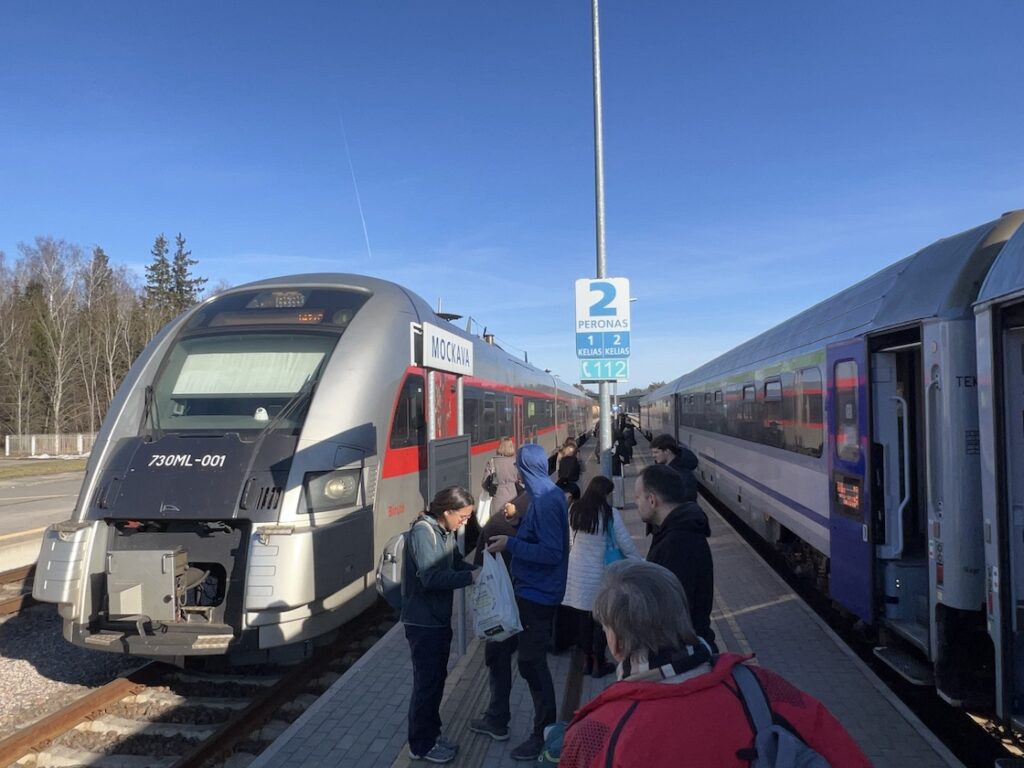 Wenige Minuten später hielten wir in Mockava (nein, nicht Москва́/Moskwa) und mussten den Zug verlassen. Der Bahnhof war mitten in der Natur und bestand aus einem leeren Bahnhofshäuschen und dafür viel zu vielen Gleisen. Die Lok der polnischen PKP koppelte ab und fuhr am Zug vorbei auf die andere Seite, um die Rückfahrt vorzubereiten. Währenddessen näherte sich auch schon der Anschlusszug der litauischen Bahngesellschaft LTG Link, mit dem wir weiterfuhren – auf Gleisen russischer Spurbreite. Der Wagen wirkte von innen riesig und ich fragte mich, ob es auch einen größere russische Wagenhöhe gab.