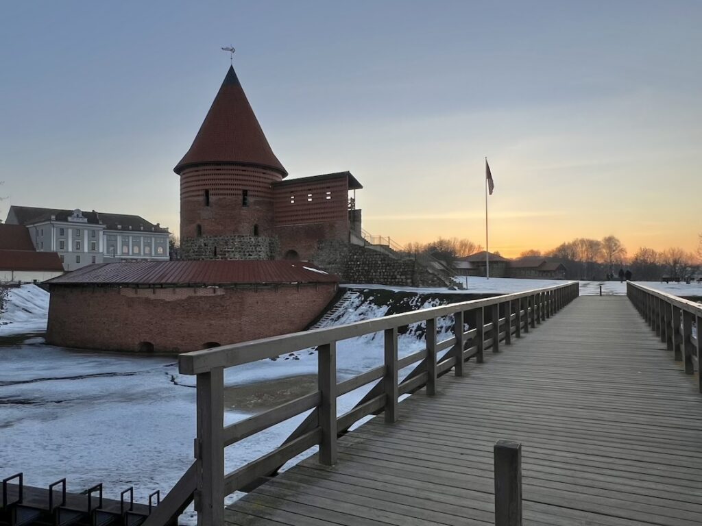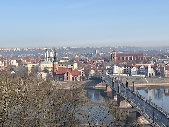 Ich hatte in Kaunas ein Hotelzimmer und keine Kapsel gebucht und ließ dort nur kurz mein Gepäck, um mir anschließend noch die Stadt bei Tageslicht anzuschauen; durch die weitere Fahrt nach Osten hatte ich nur anderthalb Stunden Zeit bis zum Sonnenuntergang. Mein Weg führte mich zunächst auf einen Hügel zu einer gigantischen weißen Kirche der Christi Auferstehung, von deren Dachterasse man einen schönen Blick auf die Neustadt hat. Wieder unten angekommen, ging ich zur Mündung der Neris in die Memel, wo sich die Altstadt und die Burg Kaunas befindet. Weite Bereiche waren verschneit und die Flüsse vereist – ich war also wieder im Winter angekommen.