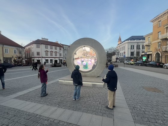 Nette Idee auf dem Rathausplatz: Ein „Portal“, durch das man Menschen in Lebensgröße und Echtzeit in einer anderen Stadt sieht (hier gerade in Ipswich, UK)