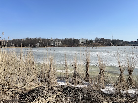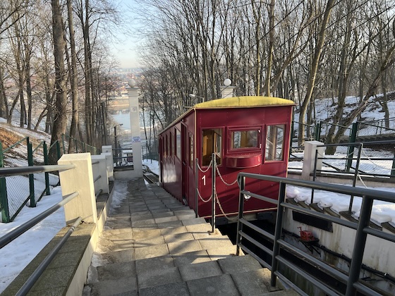 Die Aussichtsplattform befand sich neben dem oberen Ende einer kleinen Standseilbahn, die saisonbedingt geschlossen war. Der Blick auf Kaunas war wirklich schön und besser als von vor der Basilika zwei Tage zuvor. Für den Rückweg zum Hotel wählte ich den Fußweg direkt neben der Memel, denn dort war es sonnig und windgeschützt und es fühlte sich sogar neben den vereinzelt auf dem Wasser treibenden Eisschollen wie zuletzt in Hamburg nach Frühling an.