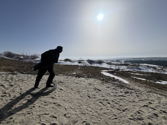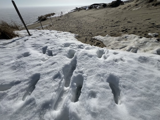 Der Bus fuhr auf dem Weg nach Nida auch durch den Ort Juodkrantė, den ich mir als Station für den Nachmittag ausgesucht hatte und in dem ich geplant hatte, nach einer zweiten Wanderung die verbleibende Wartezeit bis zur Abfahrt des nächsten Busses in einem Café zu verbringen. Als wir daran vorbei fuhren, sah ich allerdings, dass es geschlossen hatte, so wie auch die anderen Cafés und Restaurants, die wir passierten. In Nida gab es allerdings zwei geöffnete große Supermärkte und ein kleines „Café Vero“ mit Wimpeln vor der Tür. Ich erkundigte mich dort nach der Gesamtsituation der öffentlichen Kaffeeversorgung in der Gegend und erfuhr, dass ich mich im einzig geöffneten Kaffeehaus der gesamten Nehrung befand, denn in Juodkrantė sei bis April noch alles geschlossen. Ich nahm die Aussage der Verkäuferin dankend zur Kenntnis, bestellte einen großen Café Latte mit Hafermilch, bezahlte ihn mit meiner Smartwatch und fühlte mich kurz wie ein König, bevor ich mich auf den Weg zur ersten Wanderung machte. Sie verlief von Nida aus nach Süden bis zur Parniddener Düne, dann quer über die Nehrung zur Ostsee, ein Stück nach Nordosten am Strand entlang und dann durch einen Wald zurück zum Kurischen Haff zu meinem Ausgangspunkt. Der Weg laut meiner Komoot-App hätte am Fuße der Düne um eine erste Landzunge gehen müssen, aber ich erkannte schon bald, dass es dort statt eines Weges nur Schilfrohr und Schnee gab und ich deshalb die Düne hinauf zu einer Alternative kraxeln musste. Die schattigen Stellen waren noch mit teils tiefen Schneefeldern bedeckt – sie hielten mein Gewicht aber fast immer, nur ab und zu gab der Schnee nach und ließ meine Beine wadentief einsinken. Danach gelangte ich auf sonnenbeschienene Teile der Düne und die Wege waren frei.
