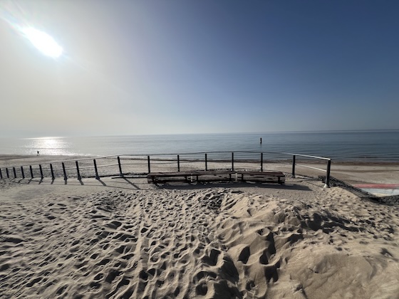 Nach ca. einer Stunde erreichte ich wieder die Ostsee bei Sonnenschein und ich genoss den zweiten Kaffee auf einem Bänkchen oberhalb des Strandes und konnte so die Zeit nutzen, um meinen Blog weiterzuschreiben. Anschließend ging ich noch für ein paar Minuten am Strand entlang in der Hoffnung, Bernstein zu finden, aber wie vermutlich die anderen Spaziergänger, die ich vorher beobachten konnte, verließ ich die Gegend, ohne reich geworden zu sein. Die Wahrscheinlichkeit, hier nach einem Tag aufgewühlten Meeres fündig zu werden, ist aber wohl gar nicht so gering, denn die Gegend ist für ihren Bernsteinreichtum bekannt.