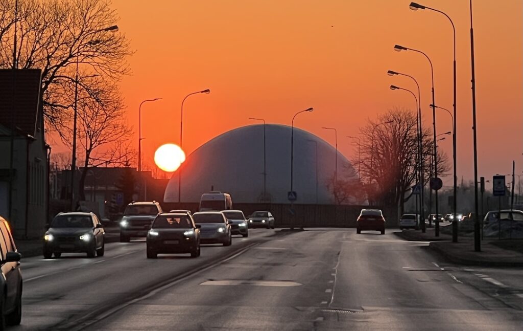 Zwei Mal rund am Horizont – Sonnenaufgang neben dem Zeltdach eines Klaipedaer Sportclubs.