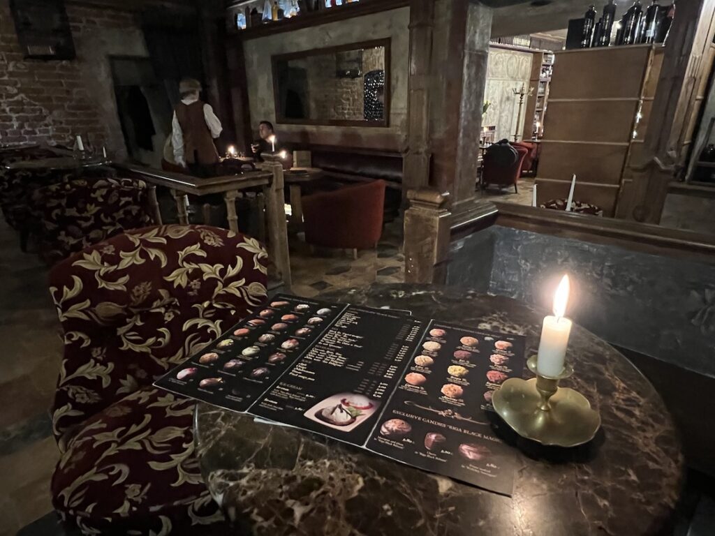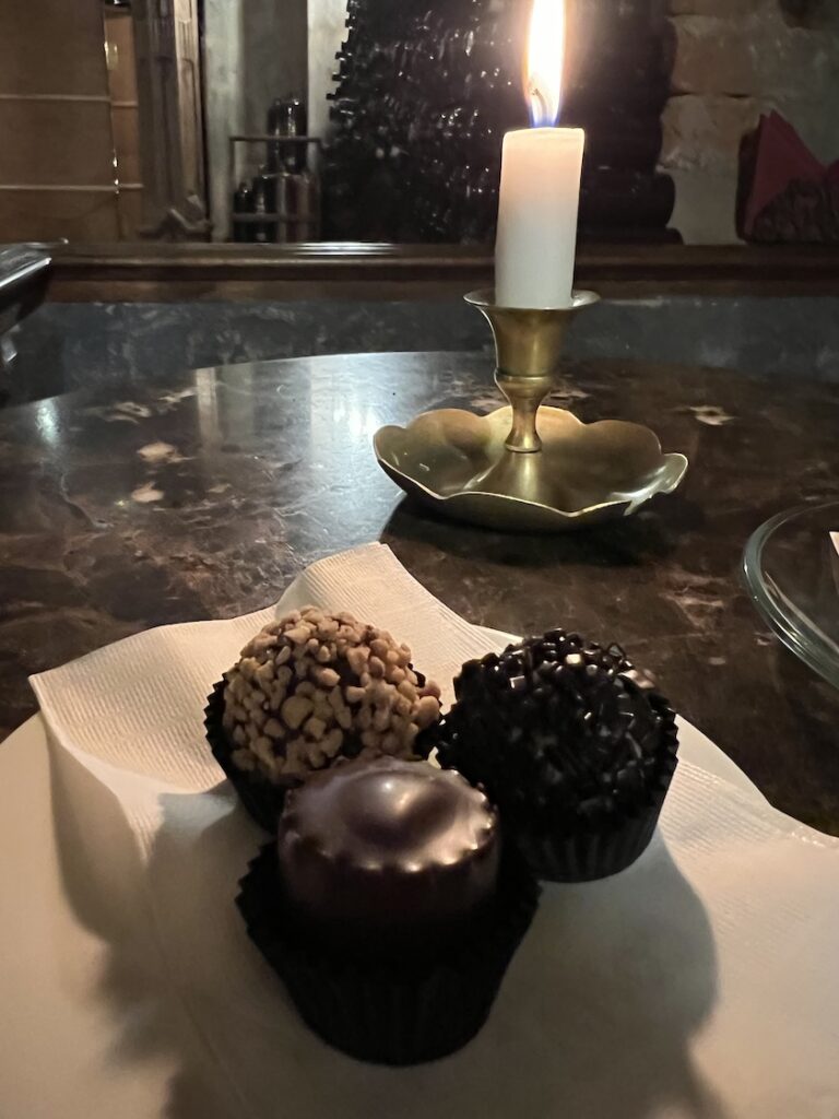 Mit gemischten Gefühlen ging ich anschließend, mittlerweile bei bedecktem Himmel, zu einer Bar, die ich am Tag zuvor zufällig entdeckt hatte, denn meine OpenStreetMap-Karte zeigte dort einen öffentlichen Weg zu einem Innenhof an. Es war eine „Schokoladen-Bar“, in der man neben den üblichen Getränken eines Cafés auch feine alkoholische Drinks bestellen konnte und die eine große Auswahl an unterschiedlichen Trüffelpralinen anbot. Die Räumlichkeiten waren dunkel gehalten, es brannten viele Kerzen auf den Tischen und aus den Lautsprechern tönten dezent barocke Klänge von Vivaldi – sehr stimmungsvoll. Beim Kellner in traditioneller Kleidung bestellte ich eine heiße Schokolade und drei vorzügliche Trüffelpralinen.