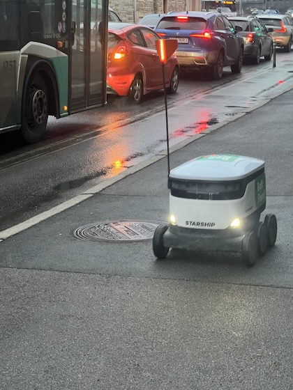 Durch die späte Abfahrt aus Riga und die lange Fahrt kam ich erst gegen frühen Abend in Tallinn an. Auf dem Weg zum Hotel fielen mir zwei Dinge auf – zum einen die mittelalterliche Altstadt zu meiner Linken, die ich plante, am kommenden Tag zu besuchen, zum anderen die plötzlich auf dem Gehweg erscheinenden Roboter, die hier rollenderweise Essen ausliefern. Ich hatte schon vorher gelesen, dass Estland derzeit mit zur digitalen Speerspitze Europas gehört, aber hier sah ich in der Tat einen Beweis dafür. Auch, wenn die Dinger schon echt cool sind, finde ich weiterhin, dass der Bürgersteig in erster Linie den Bürgern vorbehalten sein sollte, auch wenn ich vielleicht ein wenig altmodisch bin und bei der Vorstellung von zu vielen Robotern auf dem Gehweg auch an seltsame Straßenoptik und Stolperfallen denke. Und bis Essensroboter eingebürgert werden, dauert es vermutlich noch (glücklicherweise) ein wenig. Vermutlich wird es so sein, wie mit den E-Scootern: wenn sie der Allgemeinheit zu viel werden, wird man sie schon einschränken.