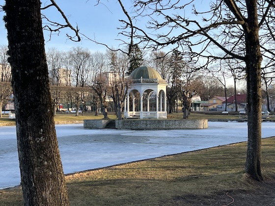 Mein Weg führte mich aus der Altstadt hinaus zur Lehmpforte, einem der bekanntesten Stadttore Tallinns. Eigentlich wollte ich dort ein stilvolles Foto der alten Gemäuer machen, aber es gelang mir nicht ganz, weil ein als Papagei verkleideter Mann pausenlos zwischen der einen und der anderen Seite entlang marschierte und Flugzettel an Passanten verteile. Ich nahm an, dass er dort noch länger bleiben würde und ging deshalb weiter in Richtung Stadtstrand, zunächst an einigen Einkaufszentren vorbei und dann an schönen Holzhäusern. Der Strand befindet sich ein paar hundert Meter entfernt von einem der Fährterminals und ich wagte dort einen weiteren Versuch, Bernstein zu finden. Leider entpuppten sich die orangenen, gelblichen und bräunlichen Teile alle als Plastikmüll und ich gab auf. Nur unweit vom Strand lag der Katharinen-Park, der Stadtpark Tallinns, in dem sich unter anderem der Präsidentenpalast befindet. Ich orientierte mich und sah einen Wegweiser zum japanischen Garten, fand aber dann dort durch eine Absperrung heraus, dass er noch saisonal geschlossen war. Der Park war dennoch nett angelegt und ich entdeckte fast wie ein Kunstwerk viele Schneehaufen zwischen den Bäumen, die in den nächsten Tagen verschwunden sein würden.