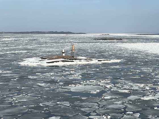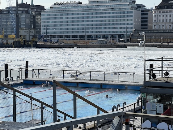 Kurz vor Helsinki häuften sich die Eisschollen und beim Passieren der vorgelagerten Inseln fuhren wir durch Packeis. In meinem Hotel angekommen, ließ ich nur kurz mein Gepäck auf dem Zimmer, denn ich wollte vor Sonnenuntergang noch ein wenig die Innenstadt besichtigen. Mein erstes Ziel waren die alten Markthallen an einem anderen Teil des Hafens. Statt frischen Dingen wie Obst und Gemüse gab es dort ausschließlich Wurst-, Fisch- und Essensstände – es war also eher ein Food Court. Die Spezialität dort sollte Lachscremesuppe sein, aber sie kostete dort überall 14,50 Euro, was ich etwas viel fand. Ich entdeckte bei einem asiatischen Stand ein deutlich günstigeres Rentier-Baguette und langte zu. Draußen musste ich allerdings feststellen, dass der Koch ein wenig geschummelt hatte, denn das Innere des Baguettes bestand aus Mayonnaise und Chinakohl, nur oben gab es eine dünne Schicht Rentierschinkenwürfel, und die hatte mir der Verkäufer noch schnell mit Röstzwiebeln aufgepeppt.